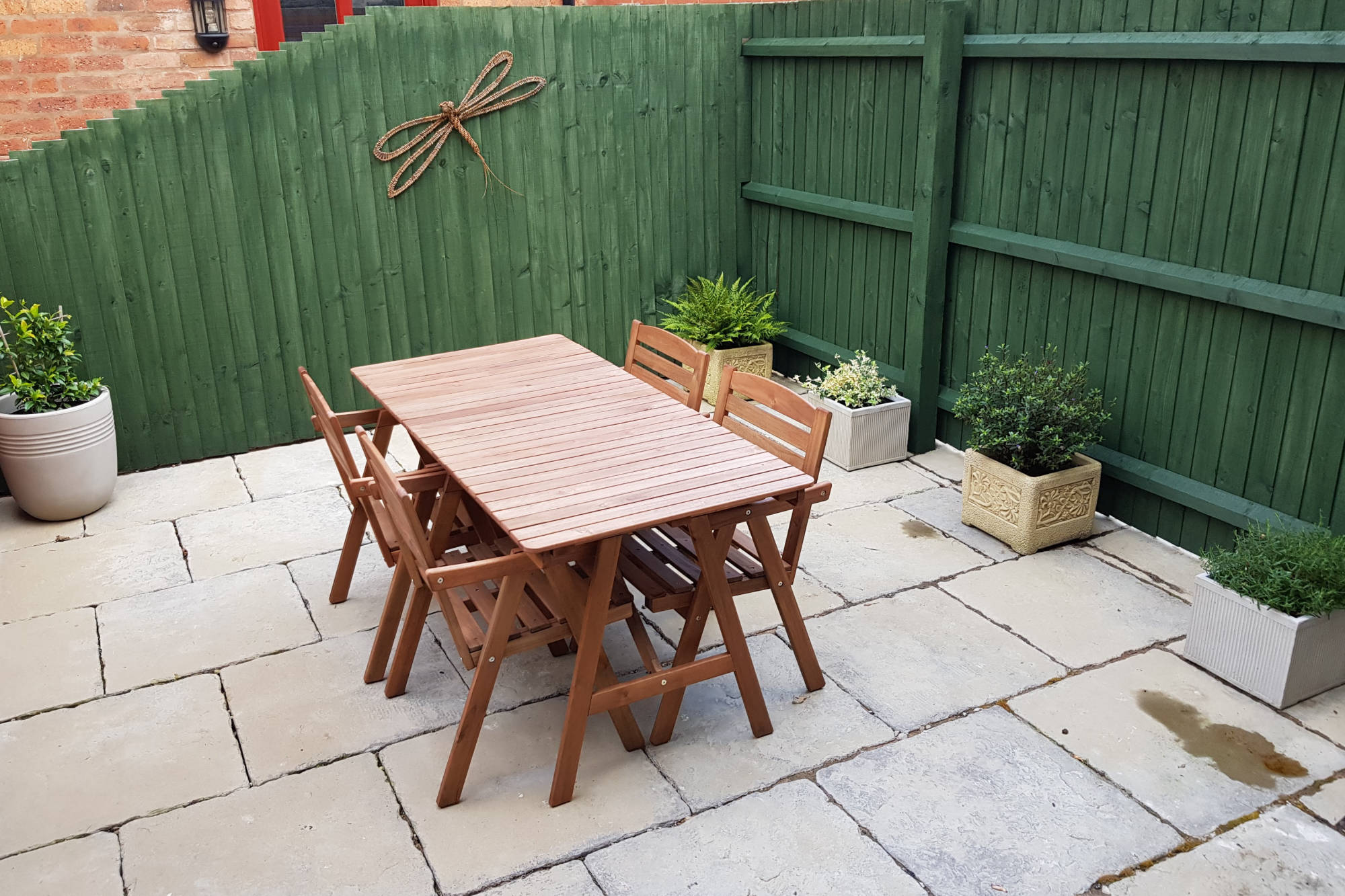 Courtyard Patio with Table & Chairs and planted pots. Cycle locking point. Private parking space immediately outside with EV charger