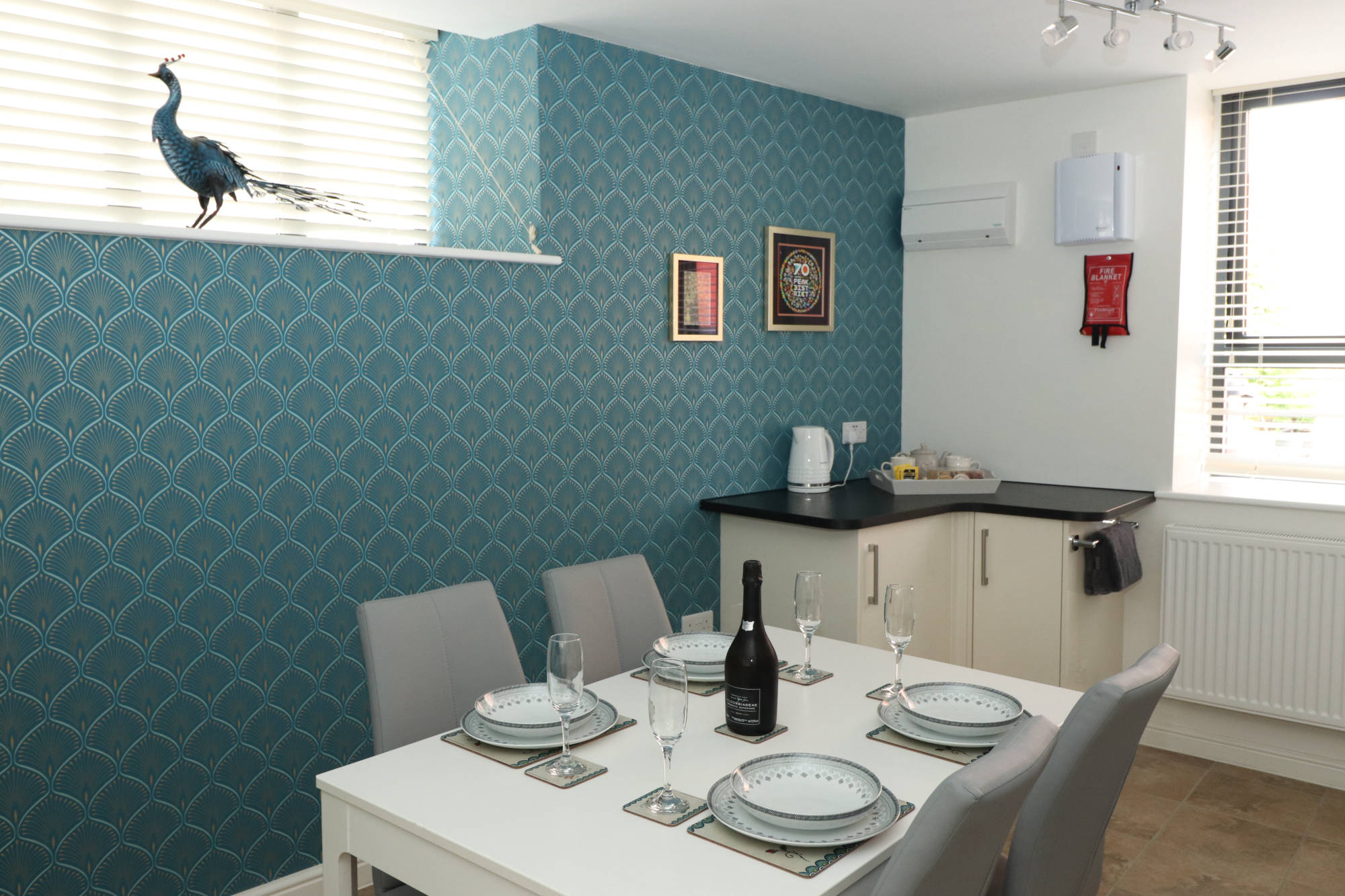 Fully fitted Kitchen with granite worktops, dining table to seat 4, oven, microwave, gas hob, fridge freezer and dishwasher.